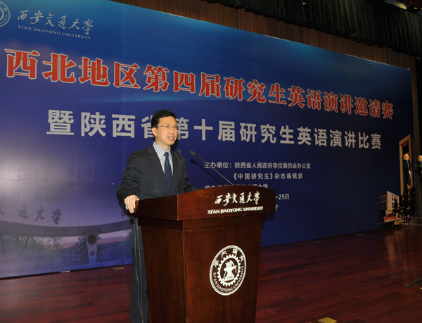 本届大赛由陕西省人民政府学位办公室和《中国研究生》杂志社联合主办,西安交通大学承办。开幕式上,教育部学位与研究生教育发展中心王立生主任、西安交通大学郑庆华副校长分别致辞,陕西省研究生外语教学工作委员会主任郭继荣教授致辞并介绍了比赛报名及组织情况,最后,陕西省教育厅李兴旺厅长宣布比赛开始。