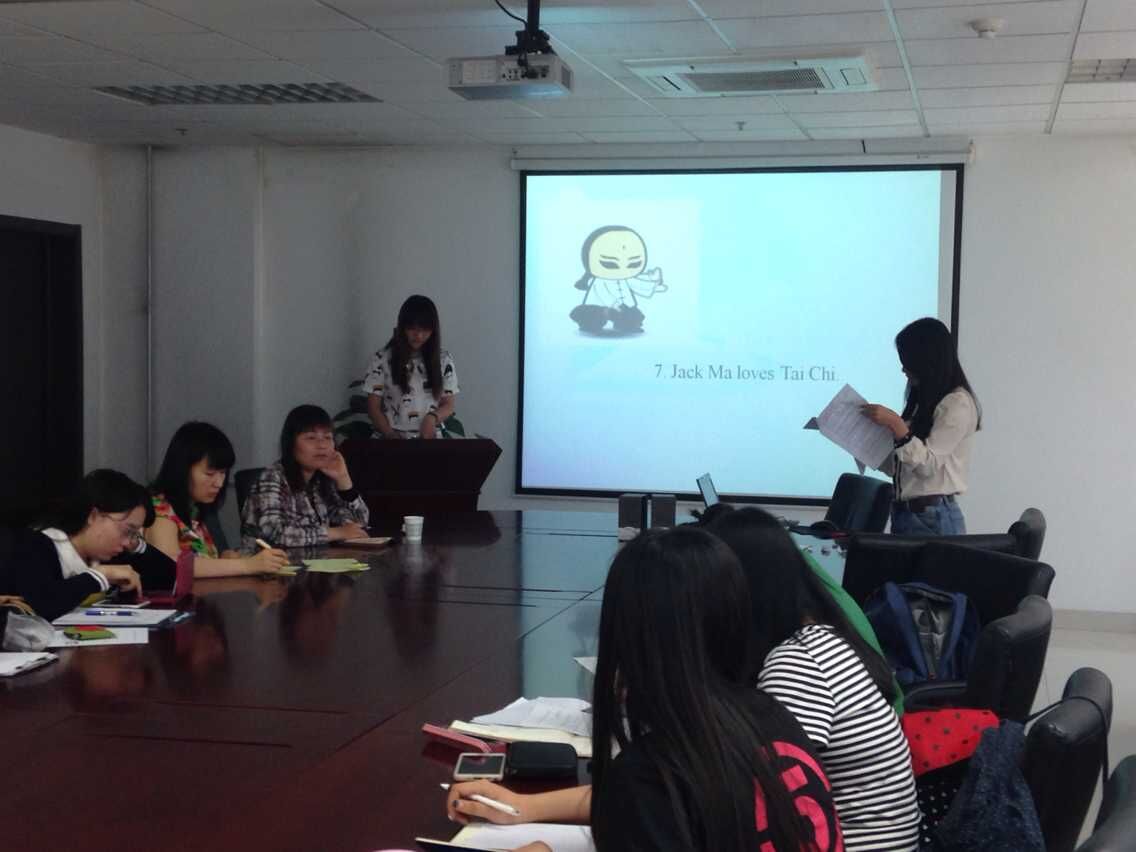 在学生演讲部分,MTI英语方向郝娟娟同学首先做主题发言,高甜、杨子同学被抽中为口译员。她演讲的主题是关于马云成功背后的九个故事。口译结束后,常虹老师对此做了点评。常老师指出,总体来看,演讲者准备充分,但材料难度应再拔高。两位同学译功扎实,展现了一定的口译素养,但仍有一些细节须关注,如演讲者和译员的位置,由于译员脑力消耗较大,如条件许可选择坐下是明智之举。再如,着装正式是译者职业使命感和专业化的重要体现,接到任务后应有条不紊地准备、积极全情投入。另外,翻译时译员应有时间观念,译语时长应小于或等于源语时间,组句应简明扼要,铿锵有力,准确传意即可。针对译员的语气助词,常虹老师谈到了一句作为同声传译前辈的经验,即“宁慢勿停,宁停勿嗯、啊”。