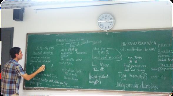 一切就绪,新的学习正式开始。在Andrew的自我介绍之后,我们开始彼此熟悉。Andrew很活泼,他年轻博学,多才多艺,对我们所提出的所有问题,他几乎都可以解释得非常细致、生动。那天,他说了很多,印象最深的一句话是“Don’t be scared , for you are to make mistakes.”这句话很简单,不过它有足够的能量击碎我们或多或少的羞怯。三个小时,快得出乎意料。同学们惊喜地发现,原来英语课还可以这样:一起做游戏,一起对话,介绍自己的生活,谈论我们的梦想,探讨需要解决的问题。前四天的主题分别是校园生活、中西饮食、课余活动以及求职信和简历的书写。现在我们已经接触到了很不一样的美国大学校园生活和学习氛围,领略了颇具特色的西方餐饮文化。不过我们并不是这个教室里面唯一的学生,Kristen和Andrew也在了解并学习着中国、西安、交大的一切。这样的学习氛围,我们很受用。