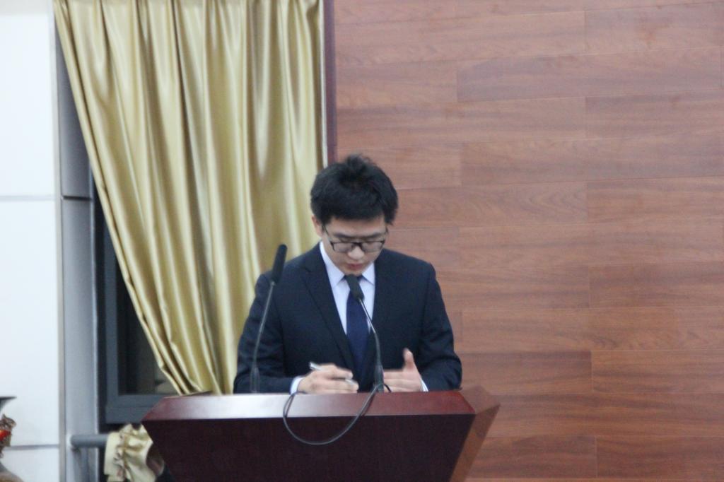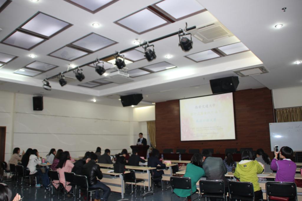 的特邀嘉宾孙宗芹老师担当评委,19名本科生和研究生参赛。本次大赛共分两个部分,英译汉和汉译英。汉译英的主题材料为习近平主席在2015减贫与发展高层论坛上的主旨演讲视频,该演讲中主要提到全球扶贫的努力和成效,以及中国的扶贫状况。英文主题材料为卡梅伦接受央视专访的一段视频,主要谈到对人民币在英发行主权债券的看法,以及中英两国关系的问题。每位参赛选手共有五分钟的时间,中英视频听力理解各一分钟左右,翻译各一分钟。