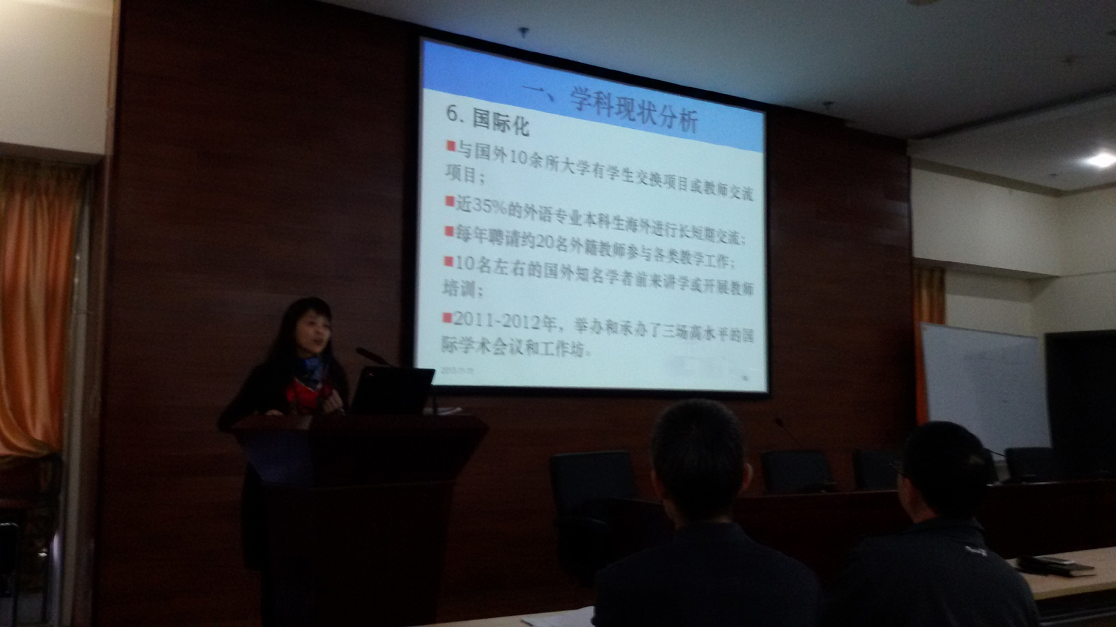 学科建设项目规划情况。她分别从学科建设背景、学科类别及构成、人才培养纲要、师资队伍、学科发展思路与布局、学科评估结果、学科建设规划目标与任务、预期成效与考核指标等方面向大家进行了详细的解释说明,让大家对pg电子官网