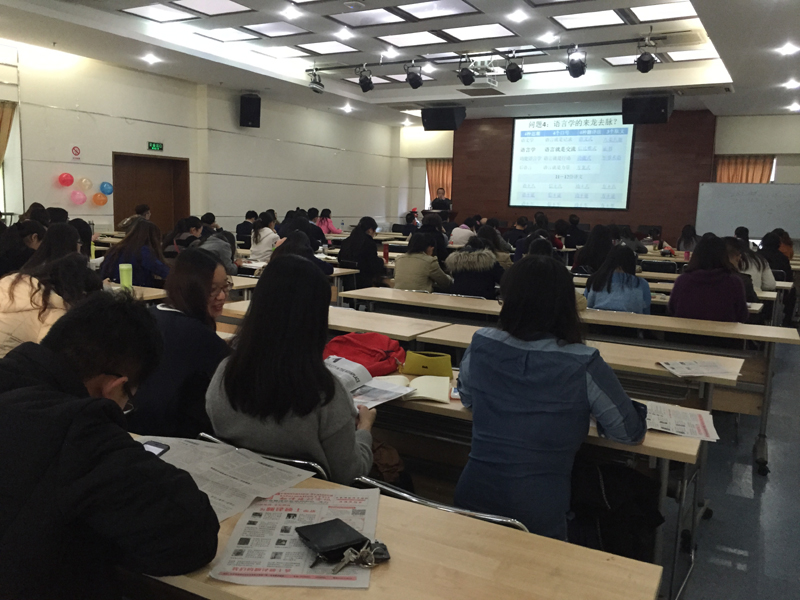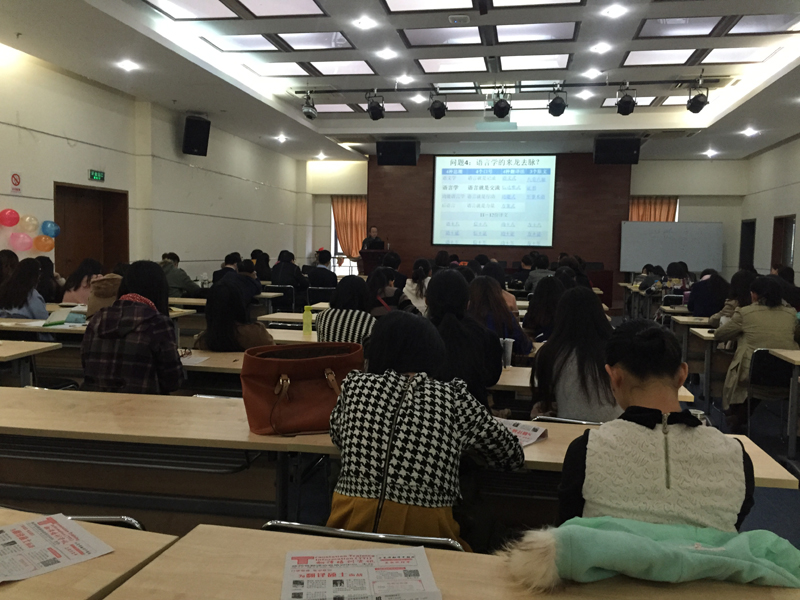 众多教师及研究生同学前来参加,现场气氛热烈。讲座由MTI教育中心兼外国语言研究中心主任聂文信副教授主持。