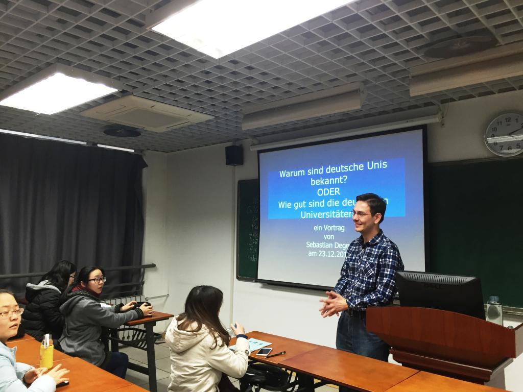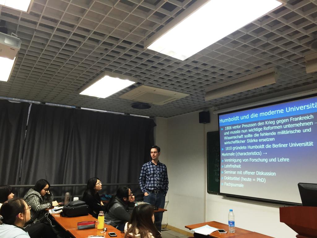 德语系外教Sebastian Degen先生为英德41班同学们进行“德国高校的发展及其优势”的专题讲座,简要介绍了近代德国高校发展史、现状、优势以及存在问题,并回答了同学们关于留学德国的相关问题。