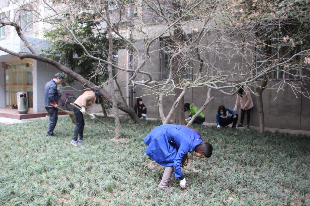 师生清扫外文楼和西二宿舍楼周边,以实际行动助力校庆。