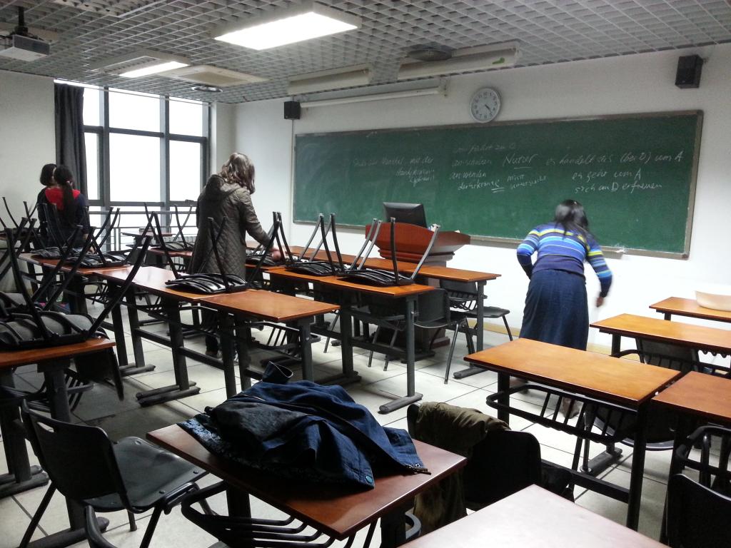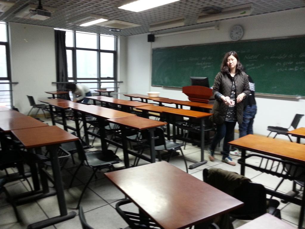 大家早早来到走廊,第六节课刚下,急忙走进教室,手持抹布、扫帚,兵分几路,分头行动,清扫地面,清理讲桌,仔细擦洗桌椅,不留死角。研究生同学清一色美女阵容,挽起衣袖,登高爬低,大显身手,令老师们刮目相看。她们配合默契,相互协作,擦得仔细,抹得认真,完全看不出平时的娇气劲儿来。