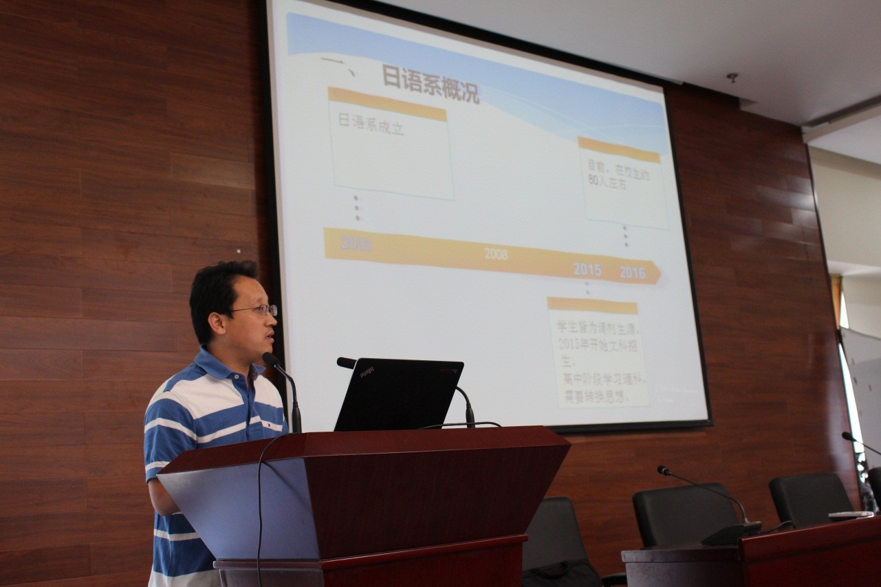的王坤老师,他以“日语精读课程的反思”为题,介绍了西安电子科技大学日语系的基本情况,以及课程设置、教材选用等。王老师还谈到理工科学生普遍存在人文学科知识储备不足,表达能力不强等问题,同时也具有做事踏实,抽象思维能力强的特质。