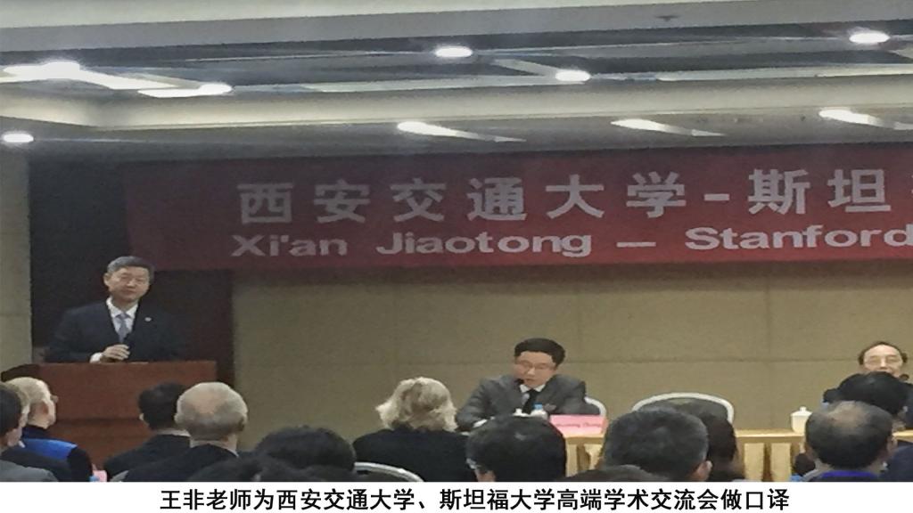 4月9日,西安交大——斯坦福大学高端学术交流会开幕式召开,张迈曾书记出席,斯坦福大学及国内有关高校专家共计60余人参加,我院MTI中心王非副教授出色地完成会议口译。