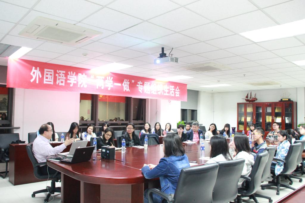 会上,主持人简要介绍了本支部,回顾了本学期支部开展的 “两学一做”学习教育情况,支部坚持经常性教育的原则,定期召开组织生活会议进行学习思考。随后,通过播放“两学一做”学习视频,全面介绍了该专题的具体内容。结合专业特色,支部四名党员对《党章》第一章第六条入党誓词部分以“汉—英—法—日”四种语言进行了交替传译,将党员意识教育与专业学习有机融合。