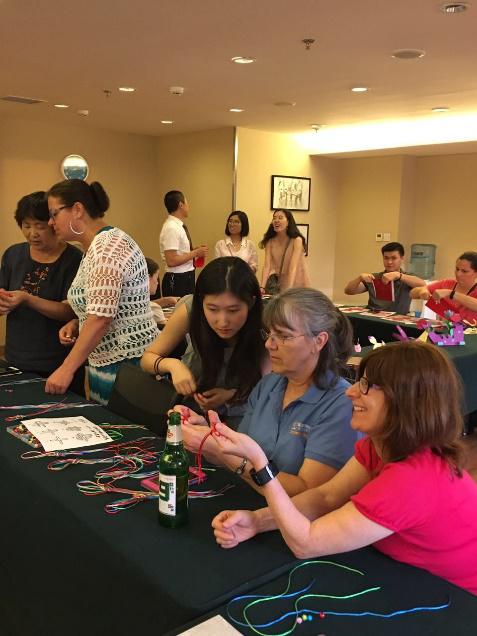本次展示的中国结有吉祥结和如意结,外教们被中国结精致的形状和缤纷的色彩所吸引,十分认真地向民间艺人请教。尽管中国结的制作过程十分复杂,每个基本结均以一根绳从头至尾编制而成,对第一次接触中国结的外教们难度更高,但在民间艺人的耐心引导下,大家最终都编制成功了五颜六色的中国吉祥结,开心地互相展示夸赞。