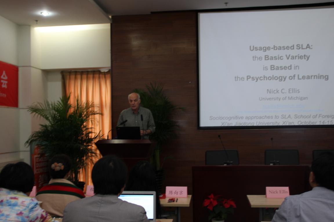 10月15日下午,密歇根大学Nick Ellis教授在研讨会上做了题为“Usage-based SLA: the Basic Variety is Based in the Psychology of Learning” 的主旨演讲。Ellis教授用简洁清晰、极富逻辑性的语言,鲜明的研究实例介绍了基于使用的二语习得研究,引发了与会者积极热烈的互动与讨论。pg电子(中国)官方网站