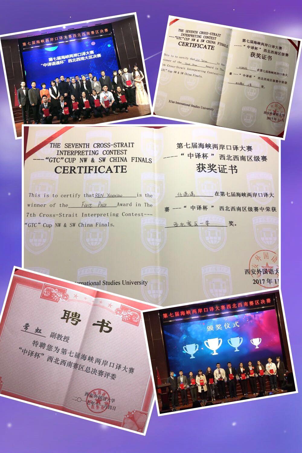 承办,中译语通科技(陕西)有限公司协办的第七届海峡两岸口译大赛西北西南赛区总决赛在西安外国语大学(长安校区)落下帷幕。来自西北西南赛区27所高校的46名选手同台竞技。我校2017级MTI翻译硕士研究生任潇潇荣获西北赛区一等奖(本赛区1名),刘雅恬获三等奖(本赛区5名);常虹副教授获评优秀指导教师。任潇潇同学将代表西北赛区参加2017年12月在对外经济贸易大学举办的第七届海峡两岸口译大赛大陆总决赛。
