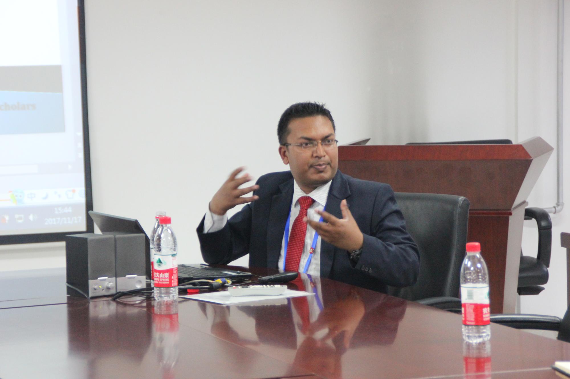 的桑仲刚博士做了题为“Process of a Translator’s Decision-making: A Leonitev’s Activity Theory Perspective”的学术报告,他认为活动理论既可作为翻译活动中译者决策活动的解释框架,也可为培养翻译策略能力提供依据。随后,来自尼泊尔的Pramod Jaiswal博士围绕“Belt and Road: Opportunities and Challenges for Nepal”作了主旨发言。两位学者发言结束后与pg电子官网