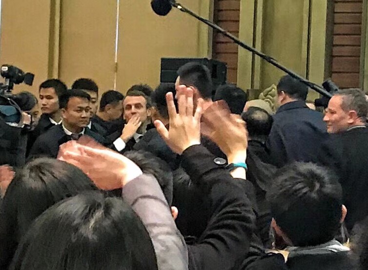 有位同学回忆起一个细节:“演讲结束后,马克龙总统在人群簇拥下准备从前门离开。前排的一位男生见到马克龙总统微笑着从眼前经过,激动得伸出手想和总统握手。出于安全考虑,总统身旁的保镖和现场工作人员连忙制止。这时,马克龙总统赶忙向前迈了一步,将手用力地伸向第一排观众席的那位男生,男生刚准备缩回的手被总统紧紧握住。现场观众席发出了阵阵欢呼声和掌声。”