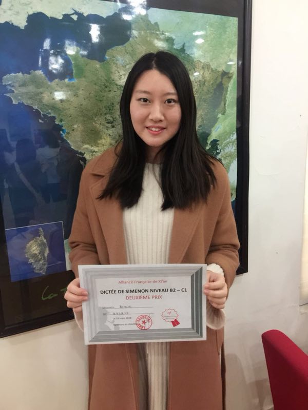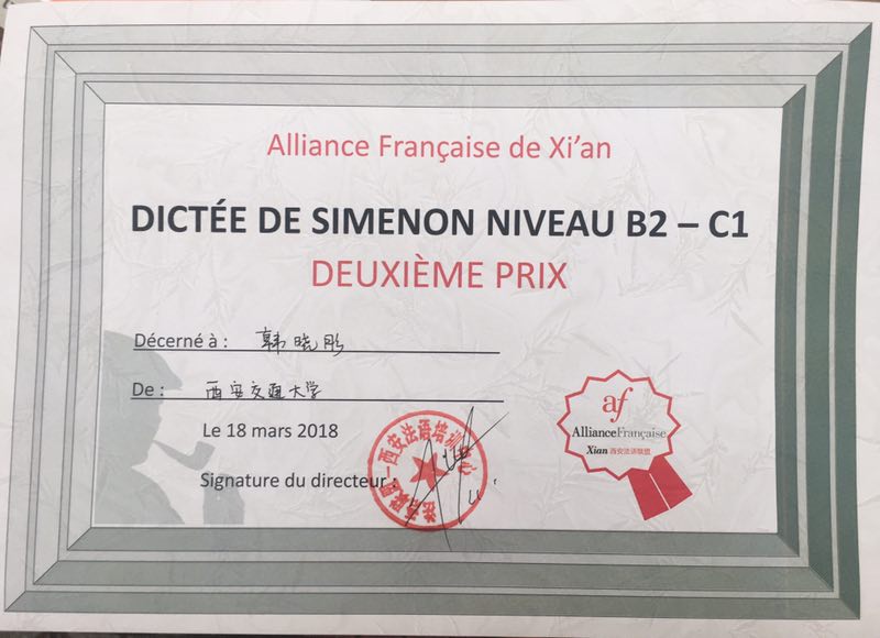 本次听写比赛内容为西默农作品节选。西安五所法语教学单位均派出选手参加比赛。我校法语专业四年级韩晓彤同学所在的B2/C1组听写内容难度非常高,对语法、词汇量、理解能力等均有较高要求。最终,韩晓彤获得了该组第二名的好成绩。