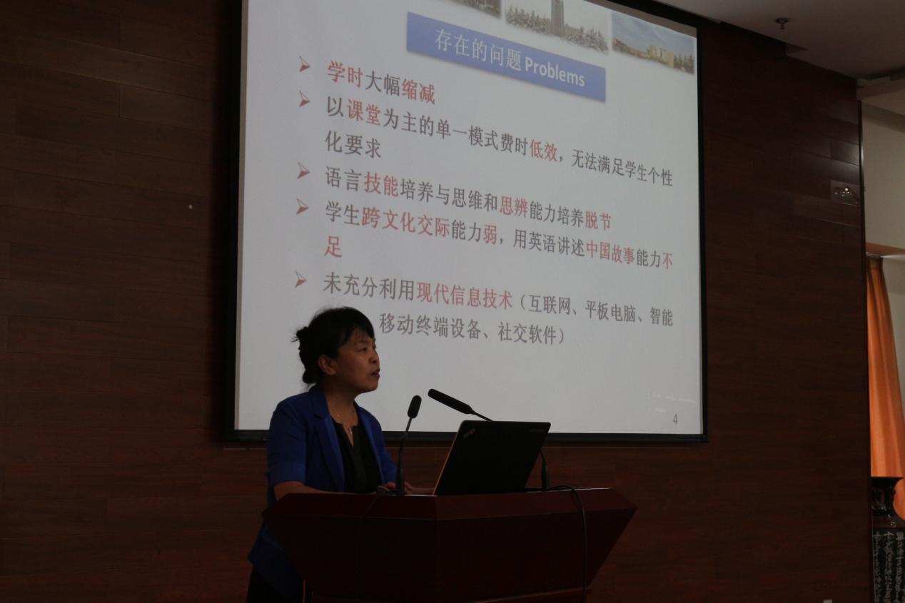 陈向京院长作了题为“大学英语视听说教学现状与基于TED TALKS的课程设计和教学设计”的报告。她阐述了当前视听说教学的现状和存在的问题,指出当前以课堂为主的单一模式费时低效,语言技能培养和思维能力培养脱节,学生跨文化交际能力弱,用英语讲述中国故事能力不强。交大pg电子(中国)官方网站