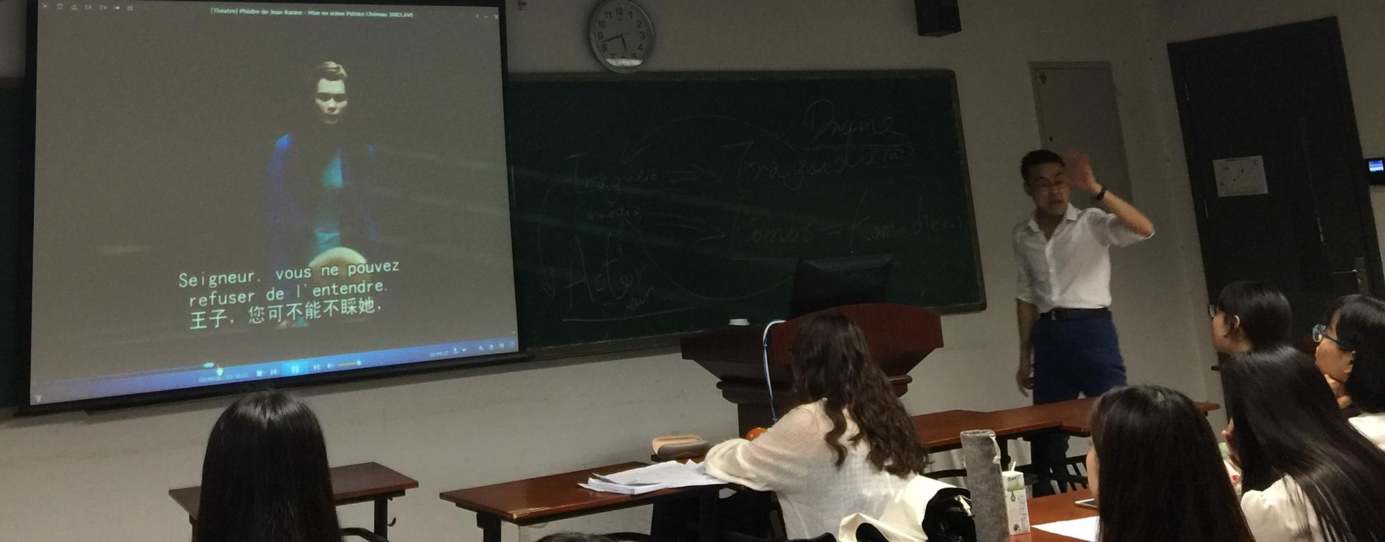 张枢导演讲解了法语中tragédie(悲剧)、comédie(喜剧)、acteur(演员)这几个词的来源和演变过程。介绍了从古希腊戏剧到古典主义时期界线分明的悲剧和喜剧;以及古典主义戏剧推崇的“三一律”:时间、地点和情节三者的一致性,即要求一出戏所叙述的故事发生在一昼夜之内,地点在一个场景,情节服从于一个主题。法国古典主义戏剧在17世纪达到欧洲的最高水平,产生了三个成就卓著的戏剧家:高乃依、拉辛和莫里哀。同学们观看了拉辛的悲剧《费德尔》片段。古典主义之后又出现了新的戏剧形式:drame (正剧),18世纪的法国启蒙思想家狄德罗称这种戏剧为“严肃剧”,对其大力倡导。