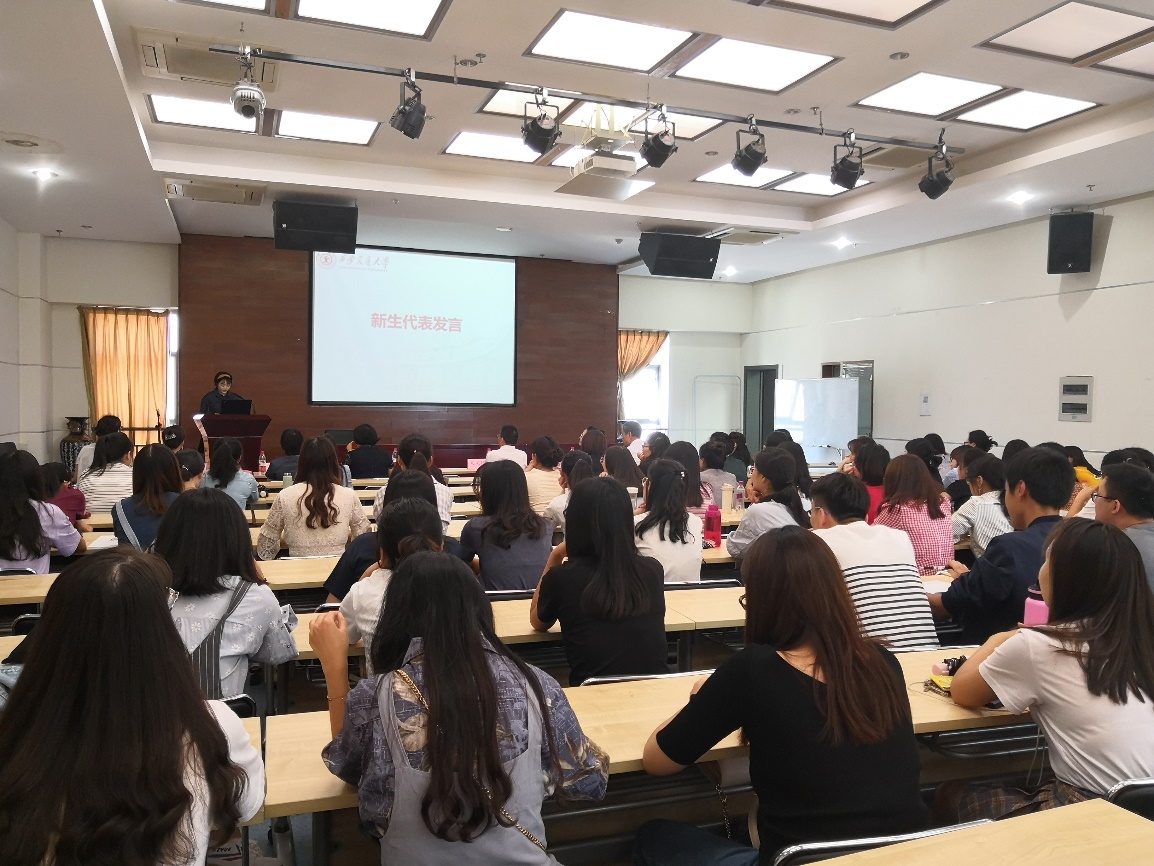老生代表发言结束后,曾就读于北京大学护理学专业的林倩作为新生代表进行发言。发言中,她讲到了自己如何从大学时的迷茫转变为如今坚定信念来到交大学习医学英语的心理历程,也说出了自己未来人生的奋斗方向。最后,她表达了自己对未来的期许,希望与同学们共同成长、共同进步。