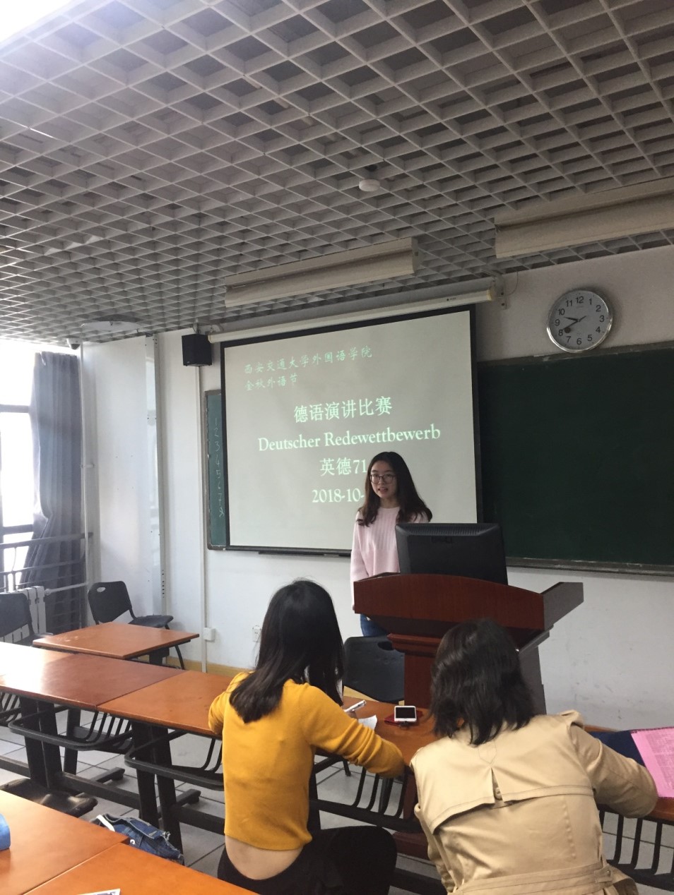 2018年10月12日上午,德语系在外文楼B503教室举办了“第十六届金秋外语节德语演讲比赛”。本次比赛围绕“幸福是什么?”这个问题展开。德语系教师何小超、赵欣担任本次演讲比赛评委。