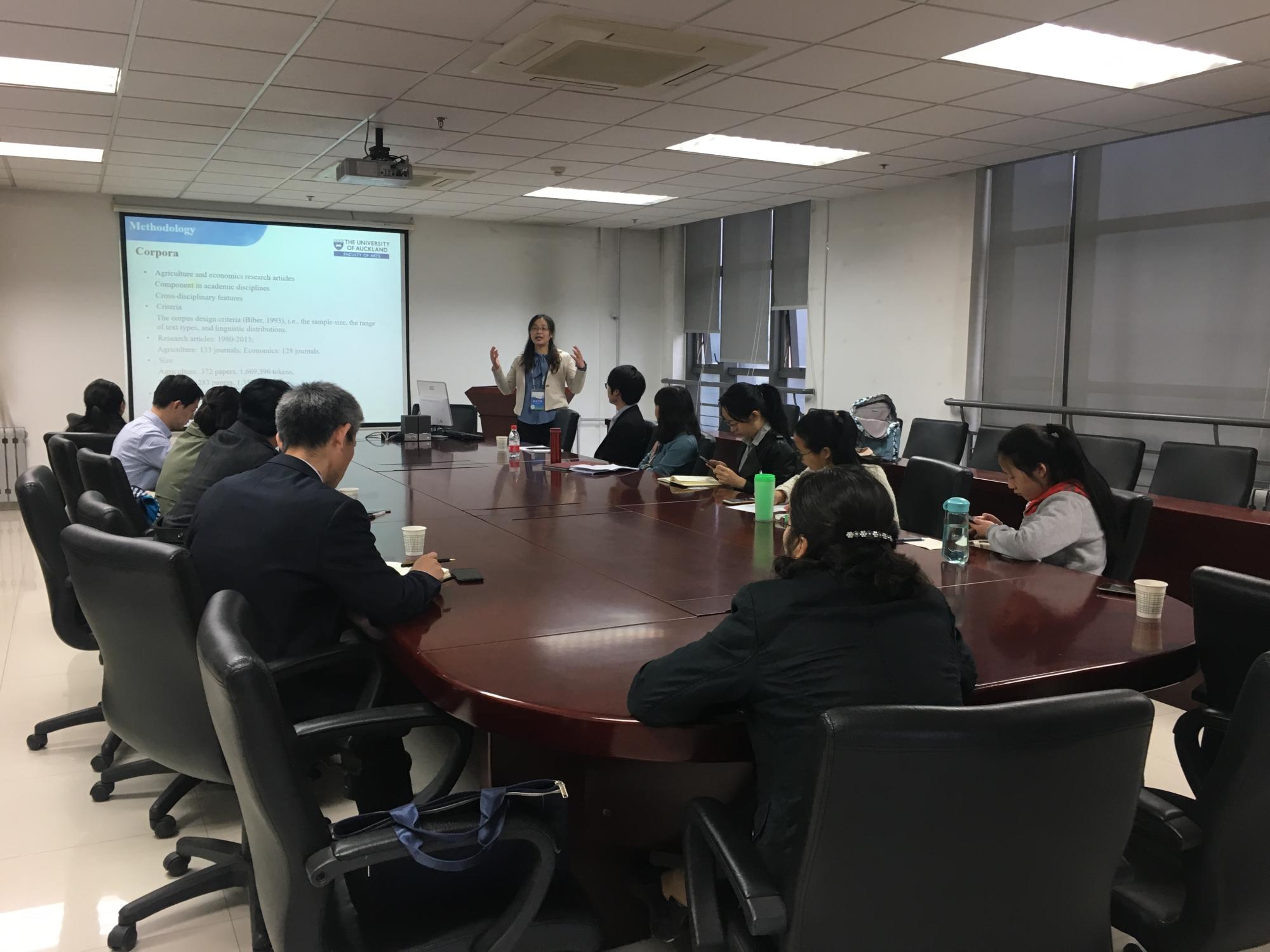 董记华做了题为“跨学科学术话语中的立场措辞学, 作家创作定位的学科变异”的讲座,通过语料库,从认知、态度、模糊限制语和指代来标记不同学术英语论文中出现的立场词,发现其使用特点及其与学科的关系,指出该研究可以帮助专门用途语言教学,帮助学生在学术英语写作中合理使用立场词。
