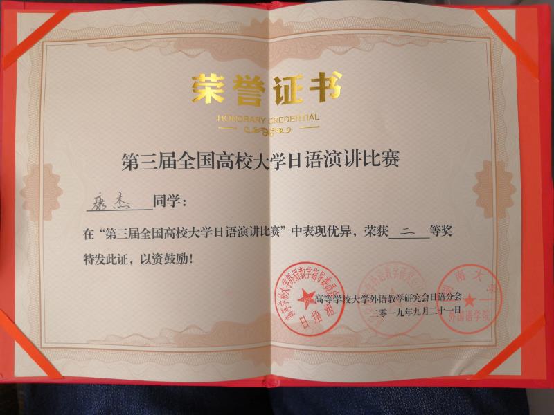 能源与动力工程专业,平时喜欢读日语小说,也喜欢日本文化。并凭着自己的兴趣,从大一开始自学日语,大二参加了学校的日语辅修专业,2018年通过了国际日语能力考试N1级。今年经过校内选拔之后,在李国栋老师和东尚子老师的指导下参加了本届演讲比赛。