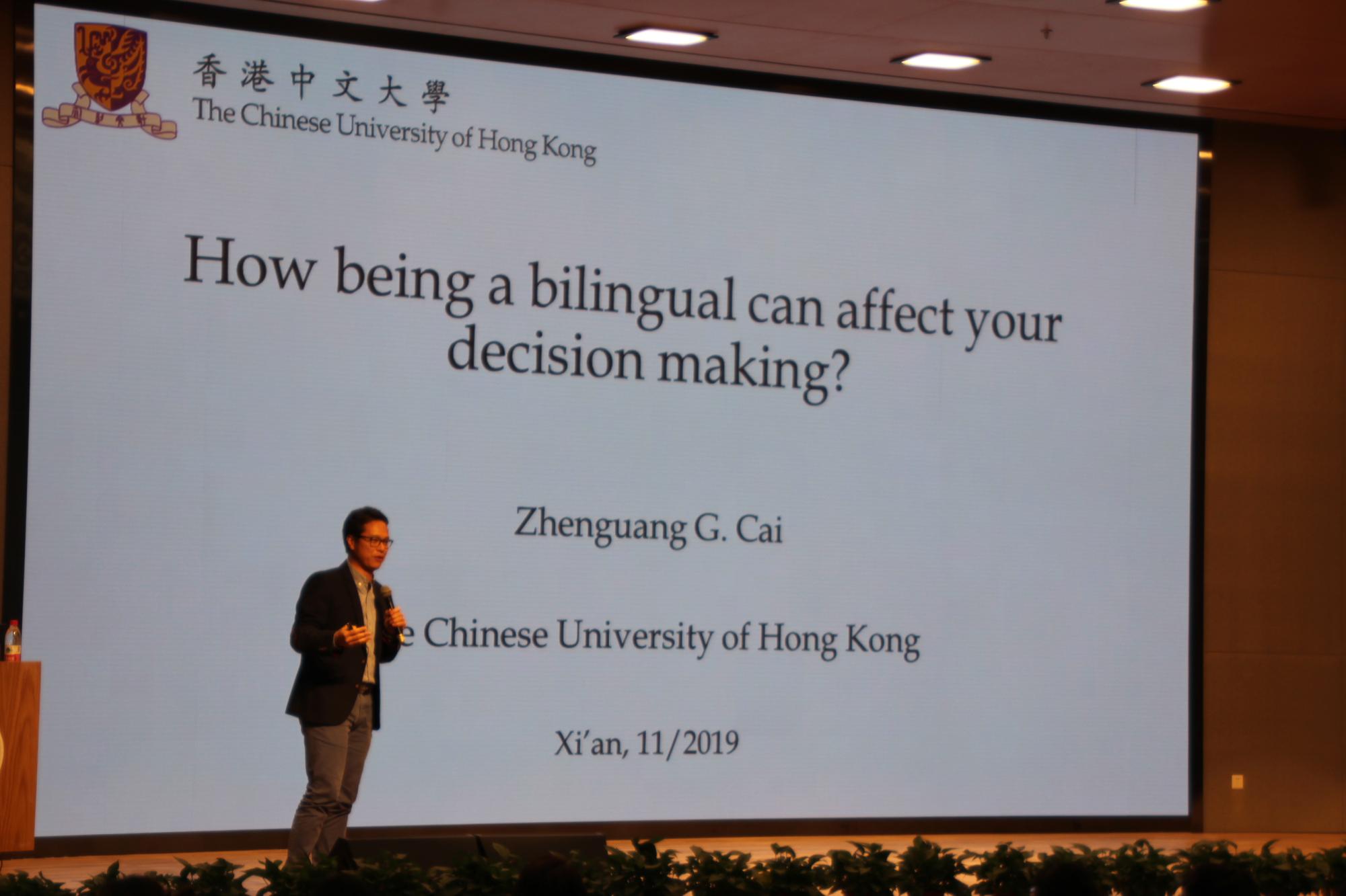 香港中文大学蔡振光副教授则通过一个个生动而有趣的小游戏将双语能力与认知决策进行联系,引发在场师生的深刻思考。蔡老师首先指出在我们生活中可能会出现语码转换的情况,但很多时候我们并不会把两种语言杂糅在一起,从而引出语言选择这一个议题。在讲座过程中,蔡老师旁征博引,从“选择正确的语言”、“进行正确的掌控”以及“做出正确的决策”这三个角度分析了使用一种语言是如何激活另一种语言、使用双语如何提升认知控制以及使用二语如何让说话者更加理性等问题。他认为两种语言在思维/大脑中紧密相连,使用一种语言意味着激活/抑制非目标语言;由于一种语言需要被抑制,使得双语者的认知控制系统更加熟练,从而提升双语者在其他领域的认知控制能力;双语者在做决策的时候,用母语思考会倾向于感性思维,用第二语言则更倾向理性思维。
