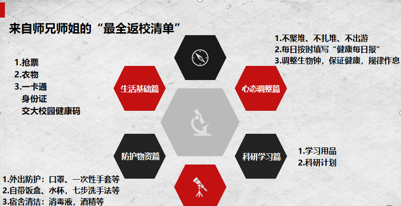 19级周天艺同学代表未返校的同学分享了自己的心得体会。她从自己对使命担当的理解,以及返校后规划与注意事项等方面发表了个人的意见看法。同时周天艺同学还为19级学生展示了“最全返校清单”,叮嘱未返校的同学在返校路途中注意安全。