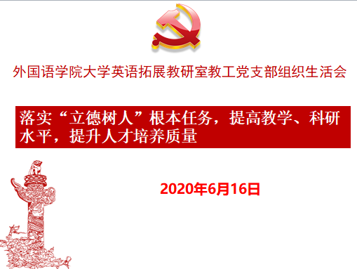 支部书记卢燕华首先带领大家回顾了“立德树人”提出的历史背景,学习了习近平总书记关于“立德树人”的重要论述,重温了《西安交通大学落实研究生导师立德树人职责实施细则》文件精神,并阐释了外语课堂在培养学生的家国情怀、塑造品格及培养责任心过程中的重要作用。