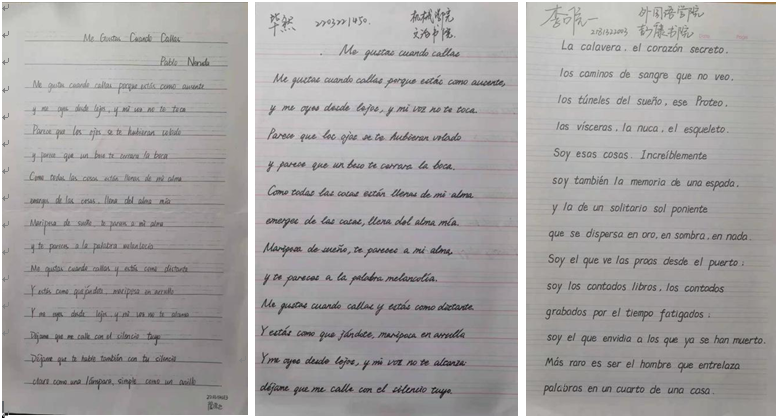 在朗诵大赛结束之后,随即进行了书写大赛的评选。西班牙语书写大赛是本届金秋外语节西班牙语协会承办的另一项比赛,于20日晚共收到来自英语、机械、电气等不同专业的同学的25份书写作品。在收集的一幅幅作品中,有花体、衡水体、简体等各种字体,线条粗细变化明显,结构匀称,精致美观。