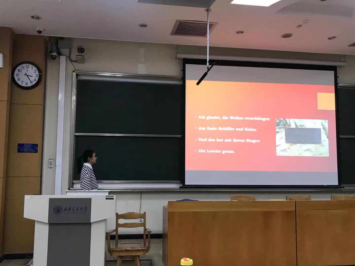 的贾芸汀同学带来了德国诗人海涅的经典诗歌《Die Loreley》,她用流利的口语为我们介绍了Loreley的地理位置,在朗诵中还加入自己优美的歌喉,吟诵出莱茵河边一位美丽女人的哀怨与叹息。