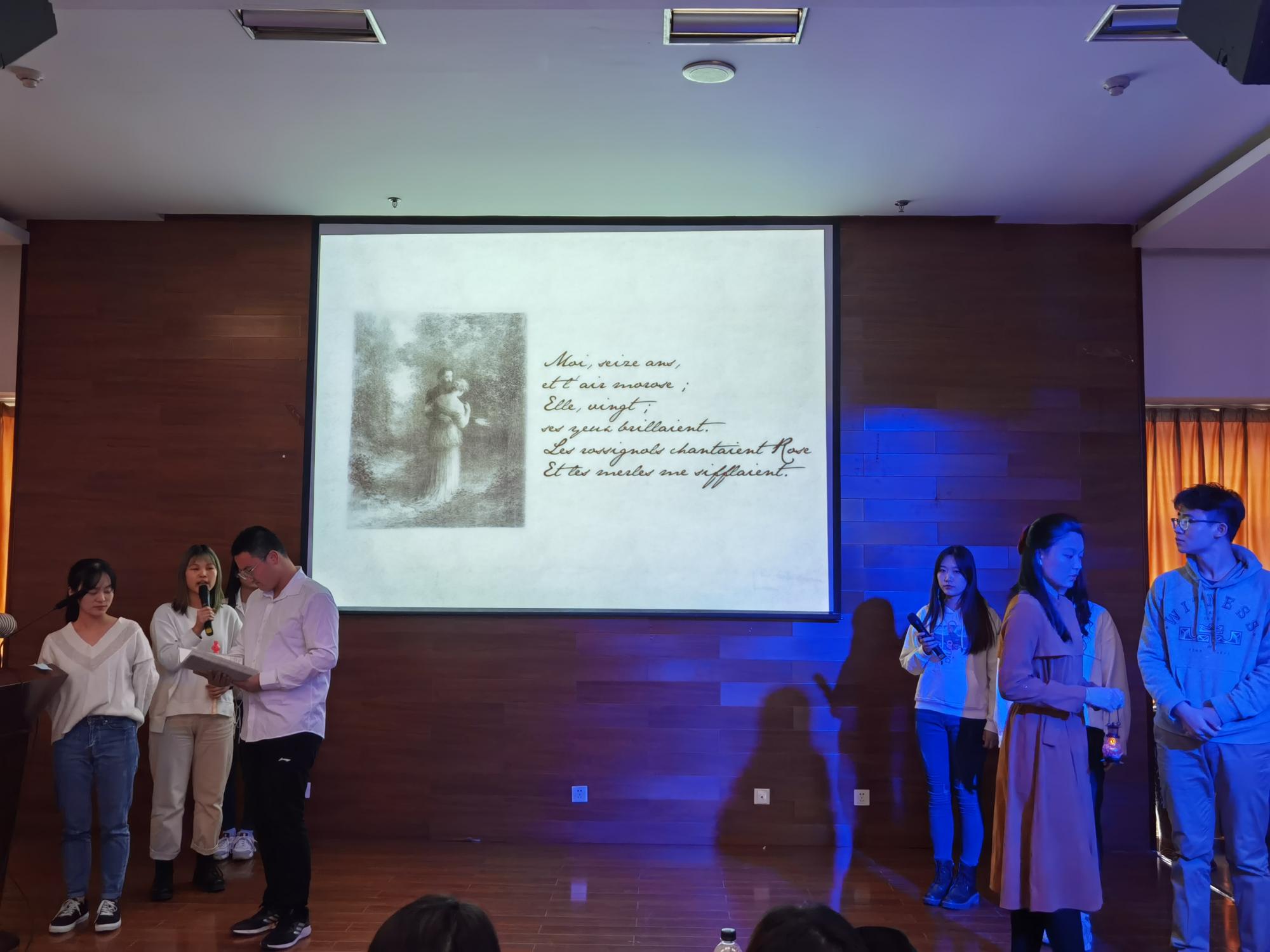 接下来的几场诗朗诵有多人朗诵也有双人朗诵,他们用叙述者沉缓的语调娓娓道来,充分表现了法语溪流般流淌的语调特点。