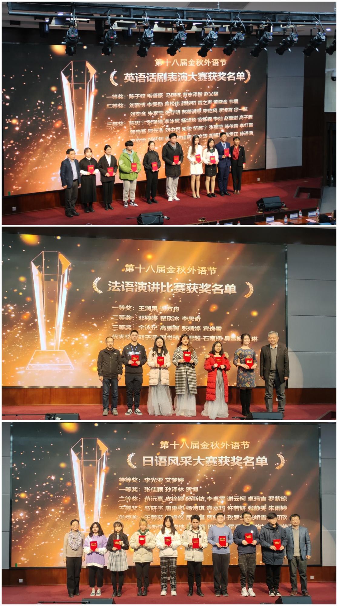 随后,举行了颁奖仪式,获奖选手分别参加了英语演讲比赛、英语辩论赛、英语话剧表演大赛,法语风采大赛、法语演讲比赛,日语配音大赛、日语朗读大赛、日语口译大赛、日语风采大赛,西班牙语朗诵大赛、西班牙语书写大赛,德语朗诵大赛,俄语诗歌朗诵比赛,外文歌曲大赛等。