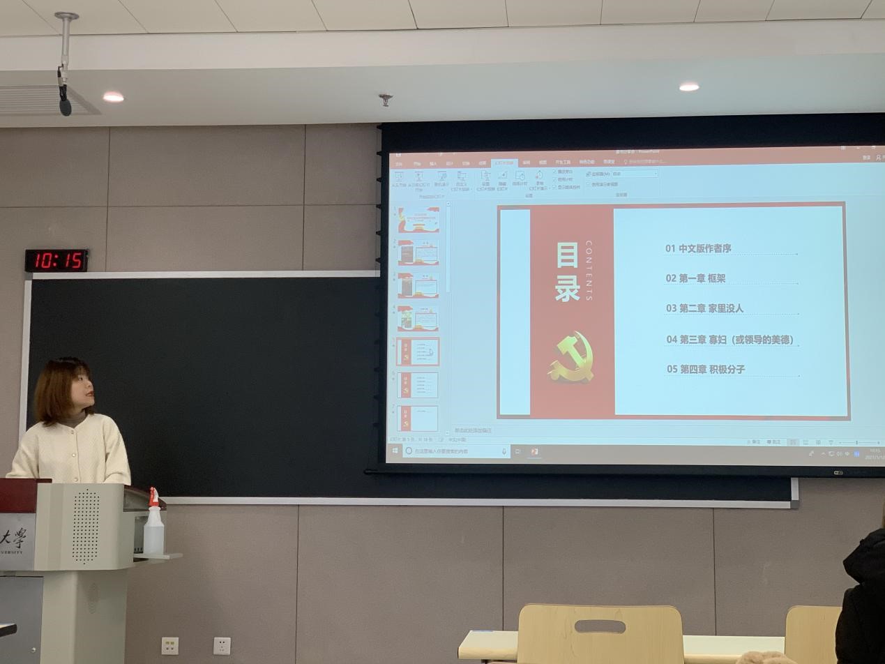 硕0118班党支部主办,郭顺鑫同学主持。本次活动分享美国作家贺萧所著《记忆的性别:农村女性和中国集体化历史》,分别由石璐瑶、郭顺鑫和马琨同学解读本书第一、三、七章。