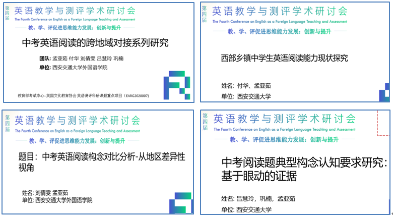 孟亚茹等在“高校分会场1”汇报了“中考英语阅读的跨地域对接系列研究”的最新研究进展。该系列研究课题依托教育部考试中心与英国文化教育协会的英语测评科研课题重点项目,主要聚焦《中国英语等级量表》三级在西北地区的对接,涉及到“西部乡镇中学生英语阅读能力现状探究”、“中考英语阅读构念对比分析:从地域差异性视角”和“中考典型阅读题认知加工过程研究:基于眼动的证据”。本次发言围绕项目启动时期的三个初步研究,旨在为西部城乡外语教学提供干预,实现教育脱贫和持续脱贫。