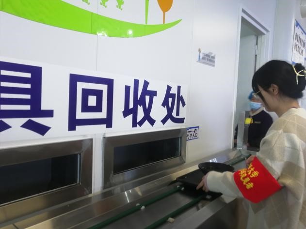 中午十二点,参加本次活动的同学下课后赶到餐厅,首先到惠园三楼餐厅的服务台与负责人沟通,领取志愿者袖章,之后就开始分工行动。本次活动主要包括三个部分。第一,在餐具回收处帮助阿姨收拾餐具,让同学们依次有序放置餐具。第二,领取抹布和盆,对餐桌进行清理,维持干净整洁的桌面环境。第三,提醒餐厅吃饭的同学珍惜粮食,争取做到“光盘”。