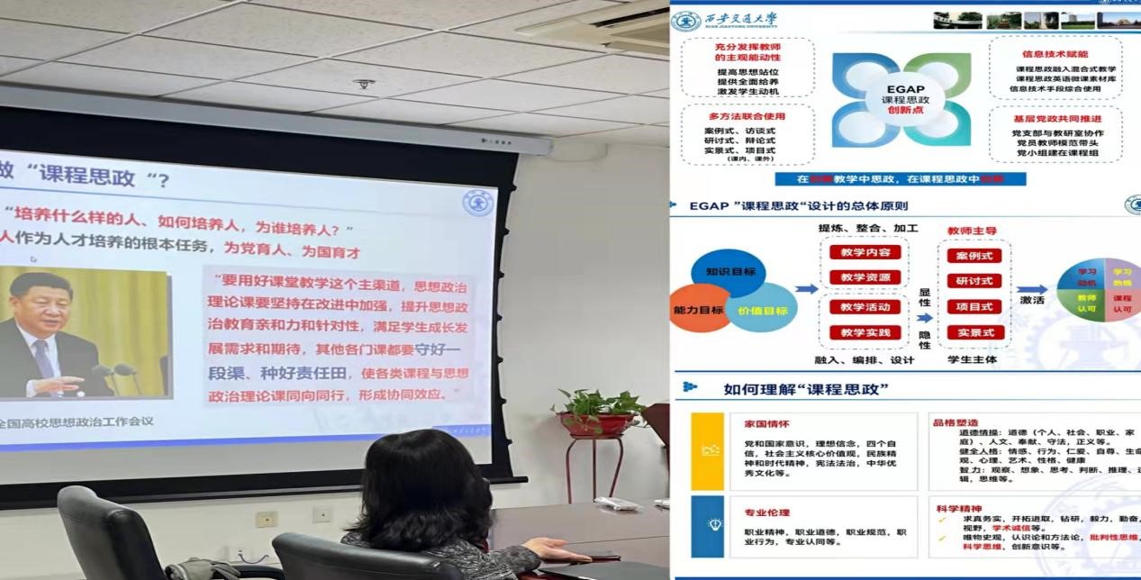 在讲座中,钱希老师还展示了她所带领的教学团队开展课程思政的成效:“通用学术英语”课程和教学团队获批了“陕西省首批课程思政示范课程和教学团队”,西安交通大学“课程思政示范课程”;钱希老师获得“西安交通大学首届课程思政教学竞赛“一等奖,”西安交通大学第二届课堂教学创新大赛”特等奖,“陕西省第三届高校课堂教学创新大赛”二等奖等;“通用学术英语”教学团队和“TED英语视听说”教学团队合作获得“2021高等学校外语课程思政优秀教学案例大赛”陕西省特等奖,进入全国总决赛;团队合作编写了12000多字的课程思政教学案例,以及以思政元素融入的《通用学术英语》教材等。讲座后,参与讲座的老师开展了深入讨论,孟亚茹、卫朝霞、邹郝晶、胡勇强、杨芳、岳真等老师发表了各自对大学英语课程思政的观点和看法,希望进一步加强理论学习和深入实践。