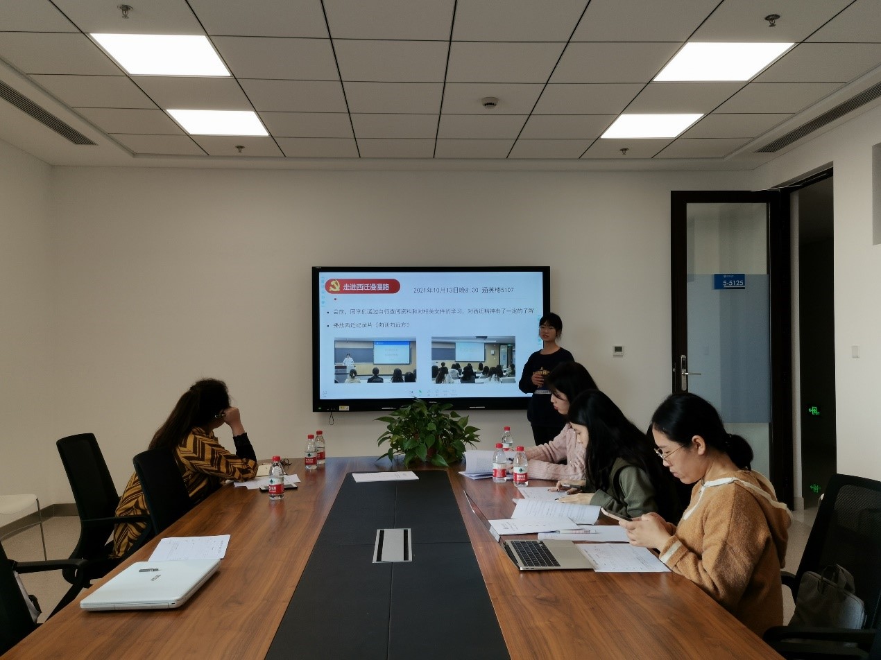 初赛主要包括两个环节,分别是三位团支部书记现场答辩和材料评审。按照硕1109团支部、硕1108团支部和硕1107团支部的顺序,三位团支书通过对支部基本情况介绍、费用使用、班徽制作、活动举办和宣传情况等多方面展示支部风采。各支部以“请党放心,强国有我”为主题,结合外语专业特色,策划组织了一系列形式多样,内容丰富的团日活动,有紧跟时事热点的学习习总书记讲话口译打卡,有学科交叉的“双碳”和AI主题讨论,也有和同学们息息相关的职业规划讲座。