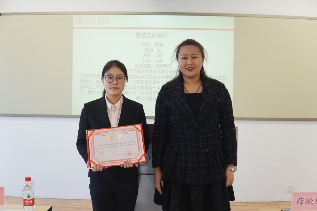 第二届研代会常任代表:周童、谢琳、石璐瑶、吕萌、张若彤、张慧敏。西安交通大学第十二次研究生代表大会代表: 周童、谢琳、石璐瑶。