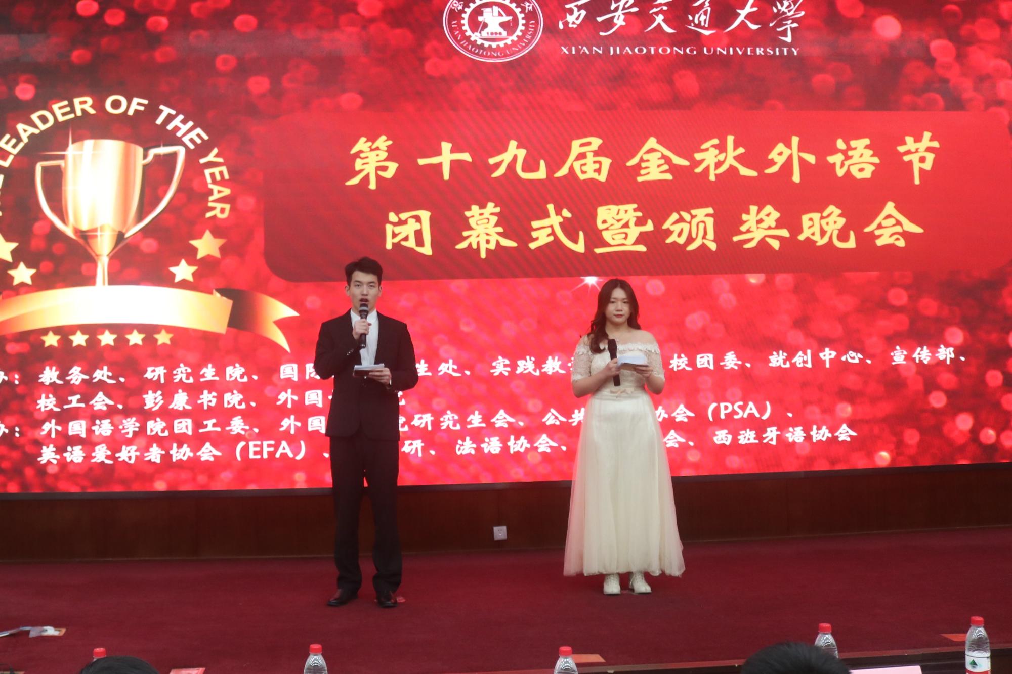 11月17日晚,西安交大第十九届金秋外语节闭幕式暨颁奖晚会在科技馆101报告厅举行。西安交大研究生院副院长程洁、教务处副处长王一鸣、宣传部副部长姚莹莹、国际处副处长雷艳君、校团委书记苏翔、实践教学中心副主任陈立斌、校工会副主席弋景峰、学生处大学生党委组织委员牛宏杰、pg电子(中国)官方网站