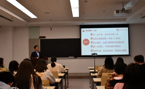 职业发展规划讲座不仅邀请到学校就创中心的老师,还有往届毕业的优秀校友。讲座内容涵盖国际组织实习与任职指导、选调生经验分享、自主创业经验分享等多个方向,满足同学们的多种需求。