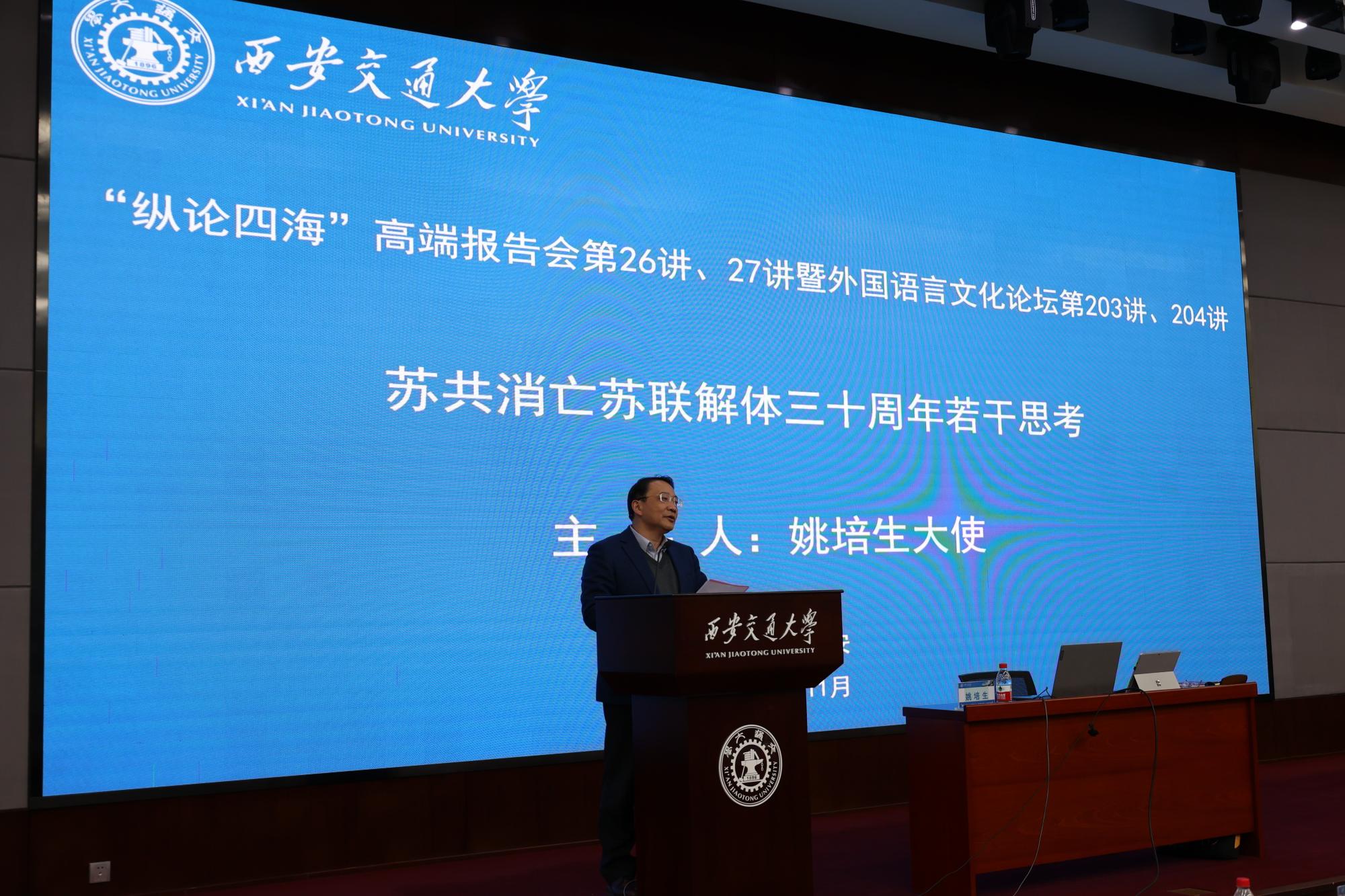 11月30日、12月1日,“纵论四海”高端报告会第26讲暨外国语言文化论坛第203讲举行,西安交通大学特邀姚培生大使分别在兴庆校区科学馆101报告厅和创新港涵英楼5-2W201报告厅,举行“苏共消亡苏联解体三十周年若干思考”专题讲座。