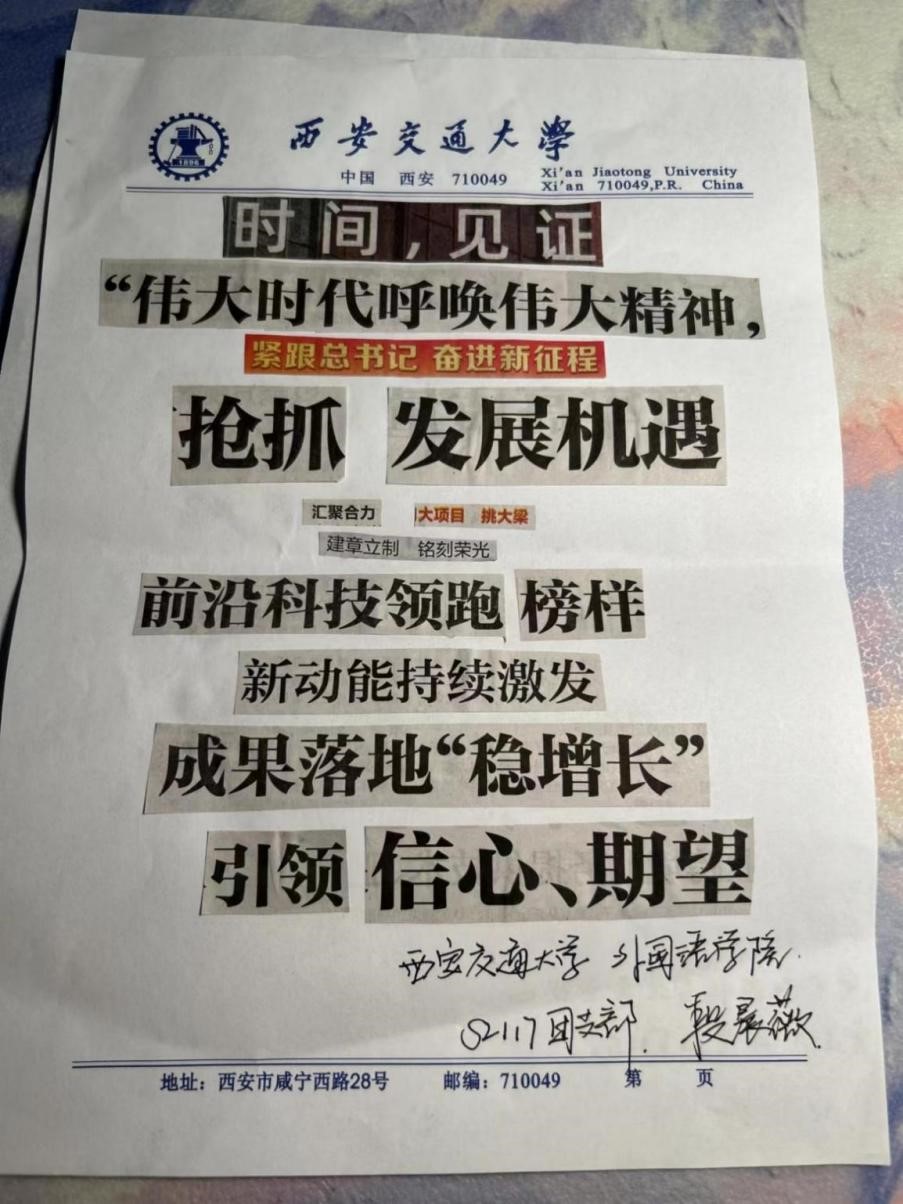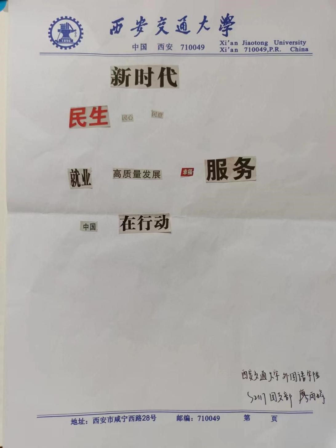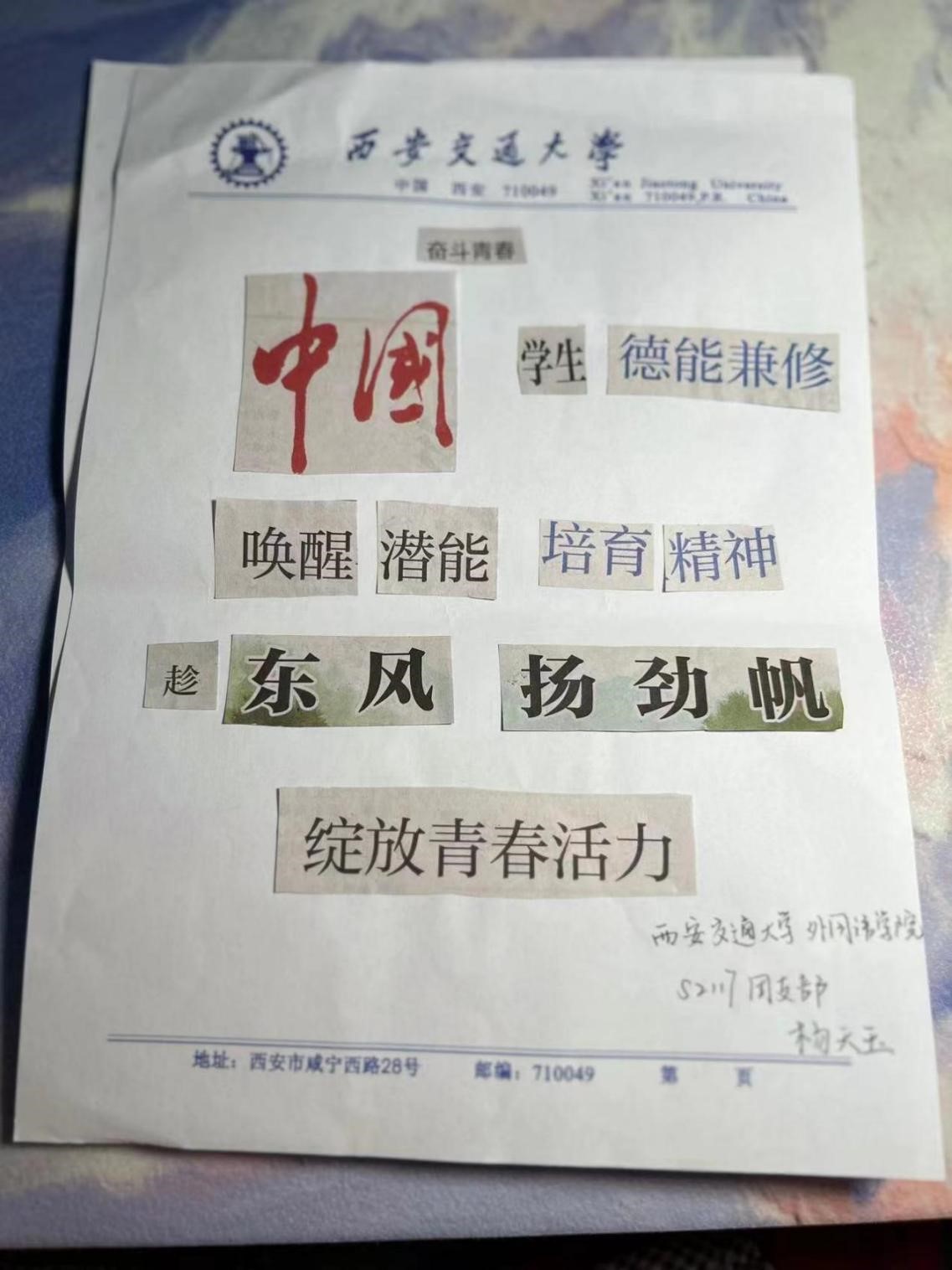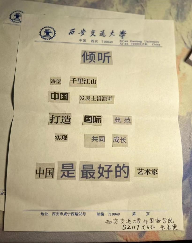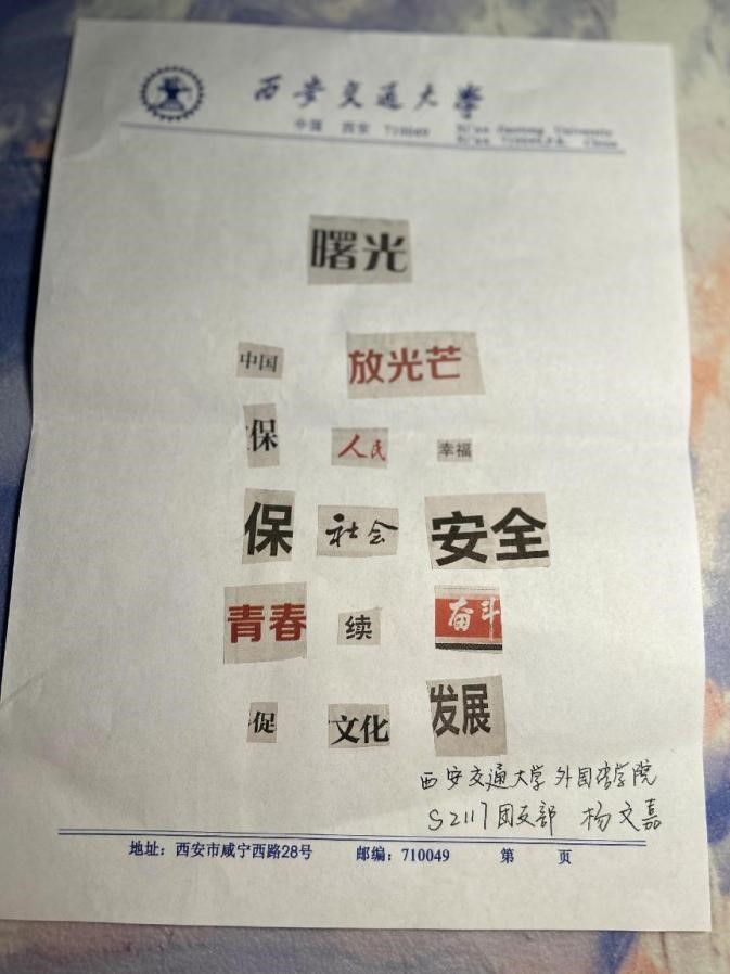 以下是部分参与同学的拼贴诗作品和立意,一字一句、一点一滴,在剪切粘合中拼接成对祖国母亲最好的祝愿,千言万语道不尽……